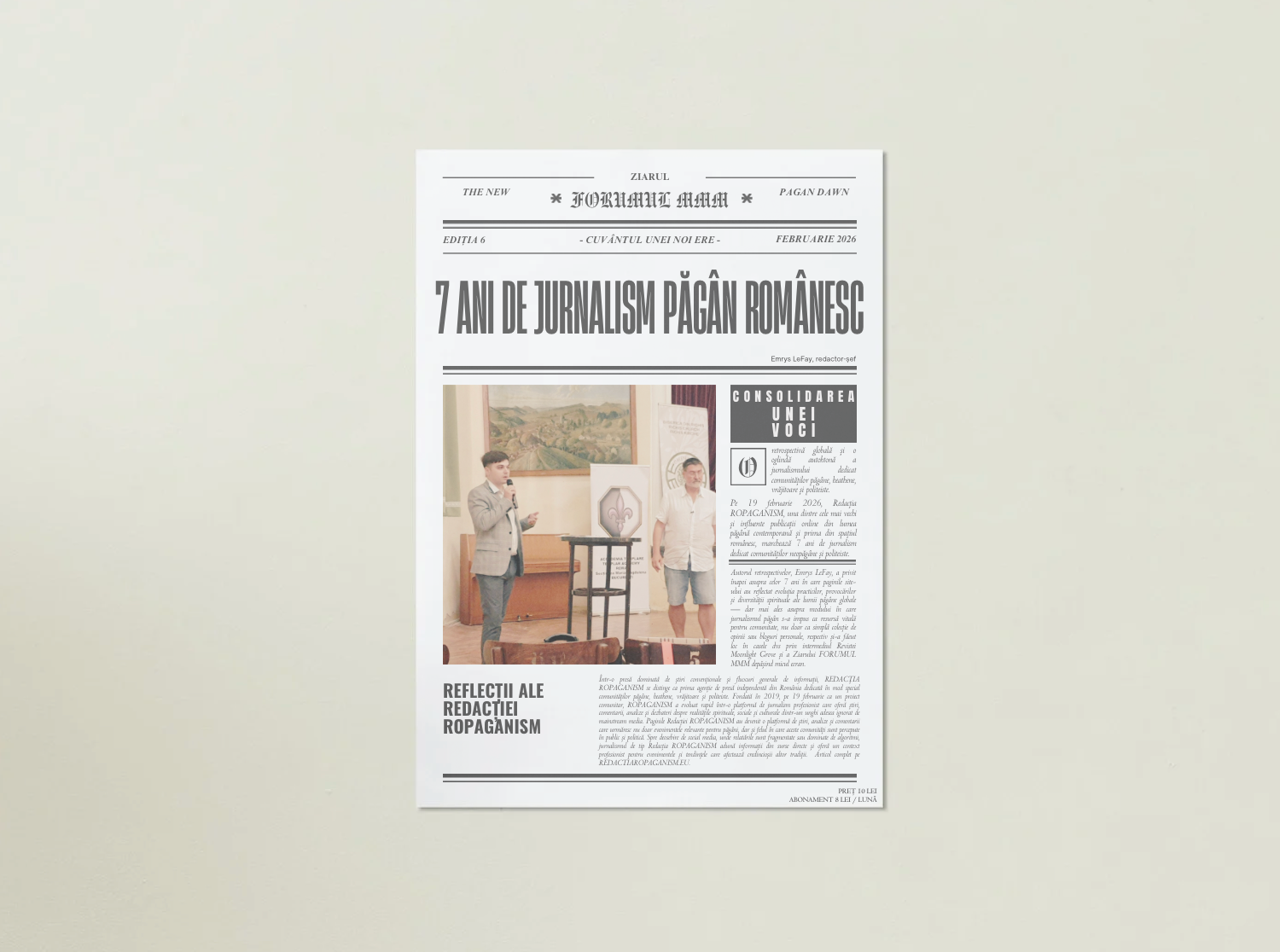 Publicat de Redacția ROPAGANISM, în parteneriat cu Asociația THE NEW PAGAN DAWN (NOII ZORI PĂGÂNI), ziarul apare lunar și aduce o perspectivă unică asupra actualității, combinând analiza culturală cu reflecția spirituală.