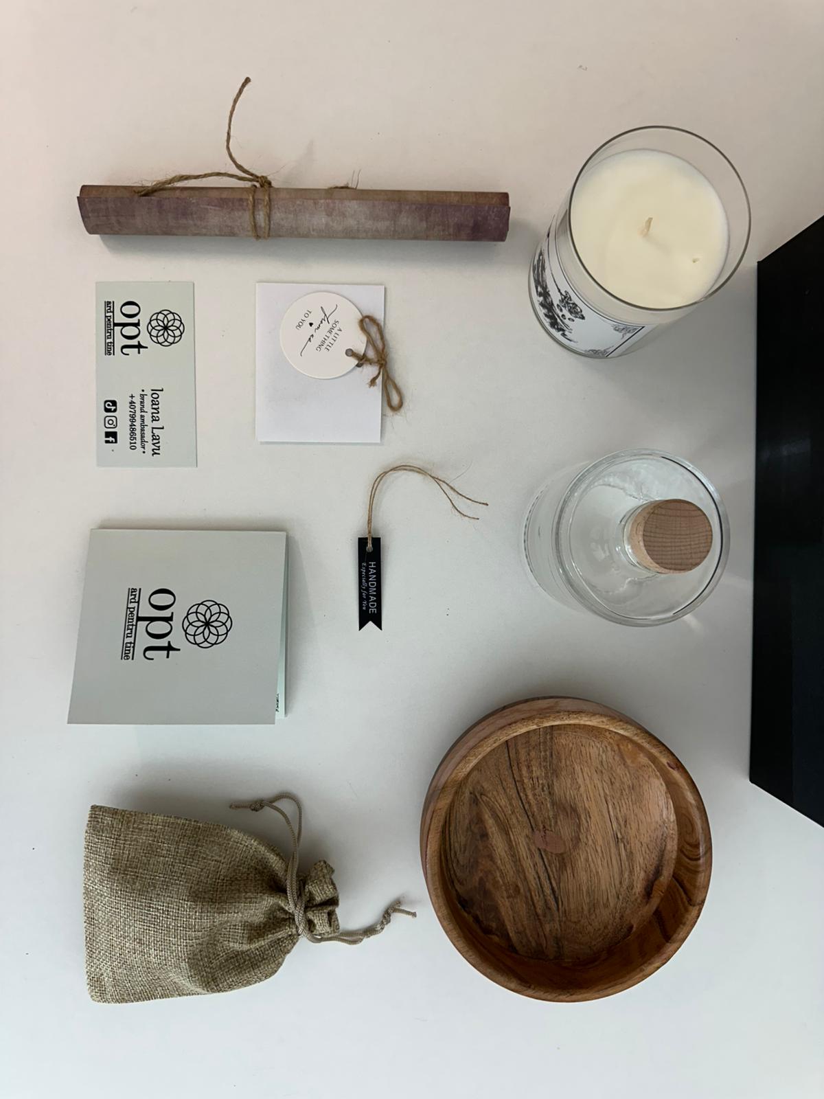 - lumânare dintr-un blend bio de ceară premium de soia (ce poate fi folosită și drept ulei, la mirungere, sau consacrarea obiectelor),