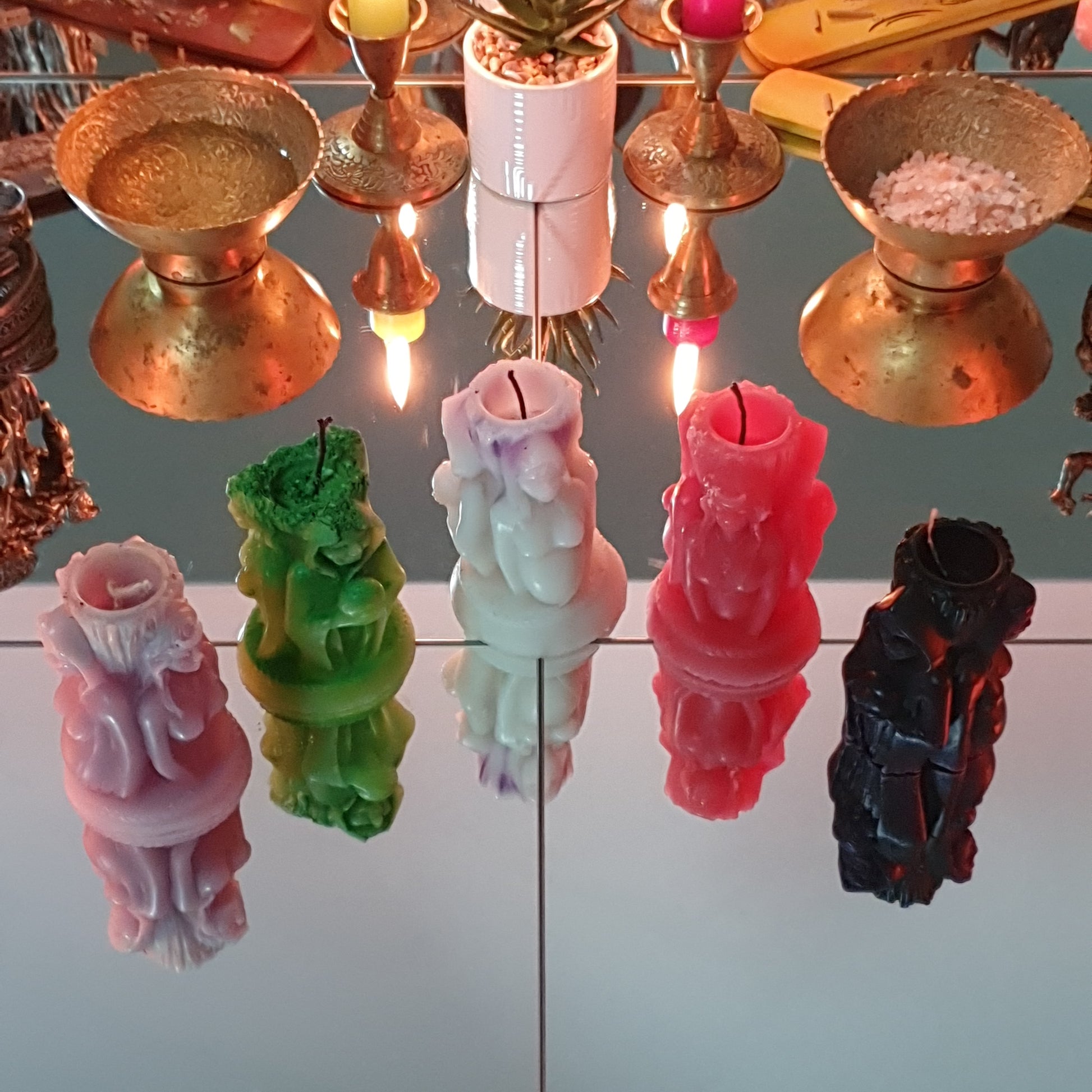Lumânare de diferite culori cu forma Zeiței Hekate. Lumânările sunt ritualizate, conform codurilor de culoare.