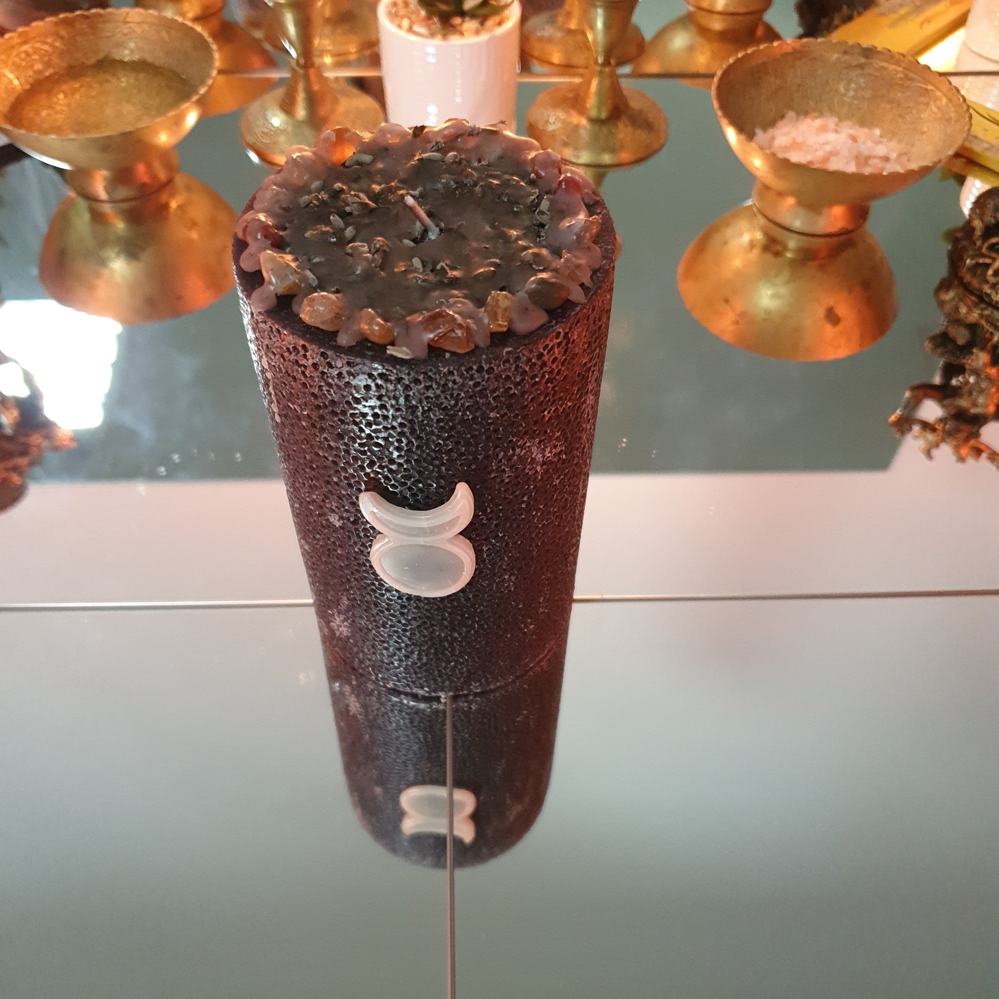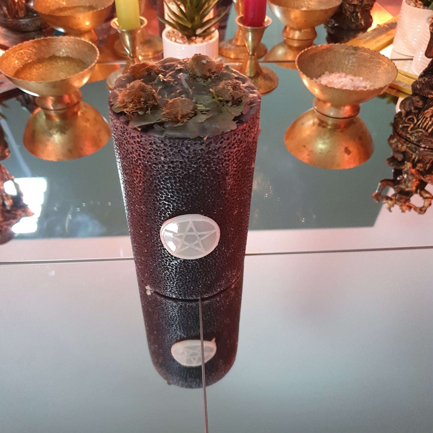 Lumânare de meditație de culoare neagră cu simbolul pentagramei sau al Zeiței atașat.