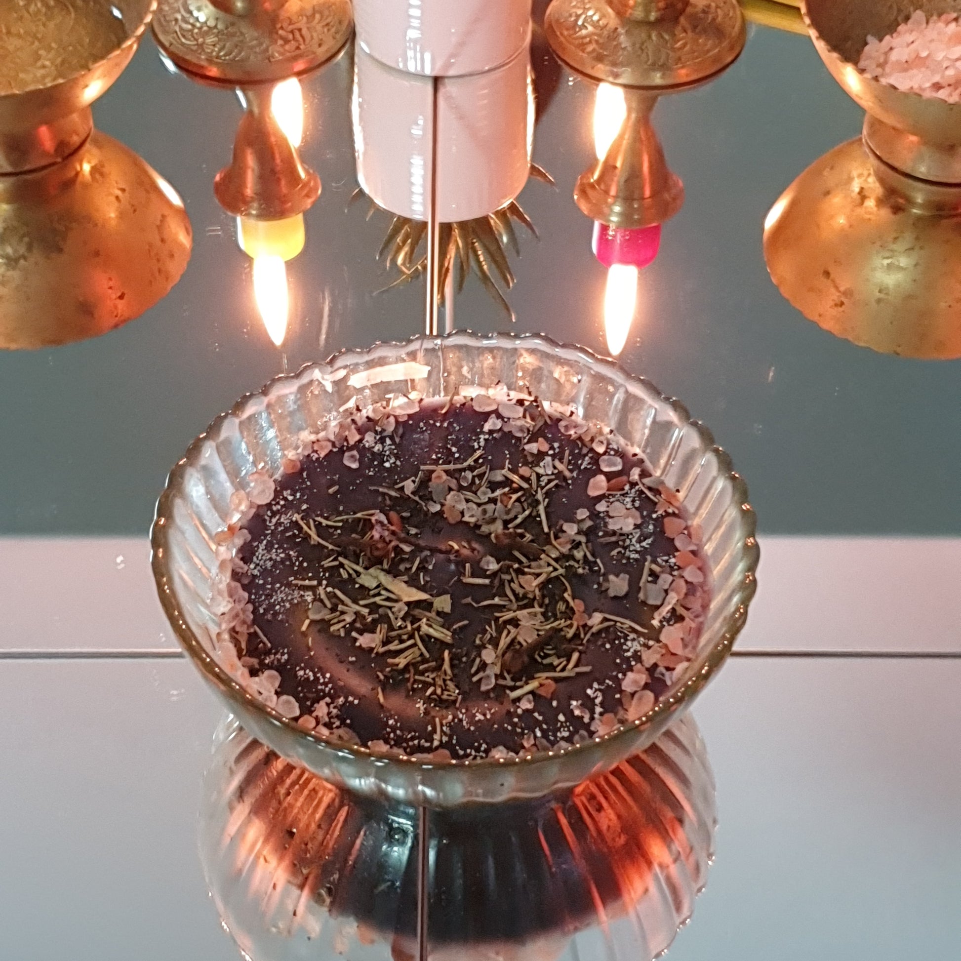 Lumânare de protecție, de culoare neagră cu diverse plante, uleiuri și săruri pentru materializarea rapidă, eficientă și de durată a protecției.