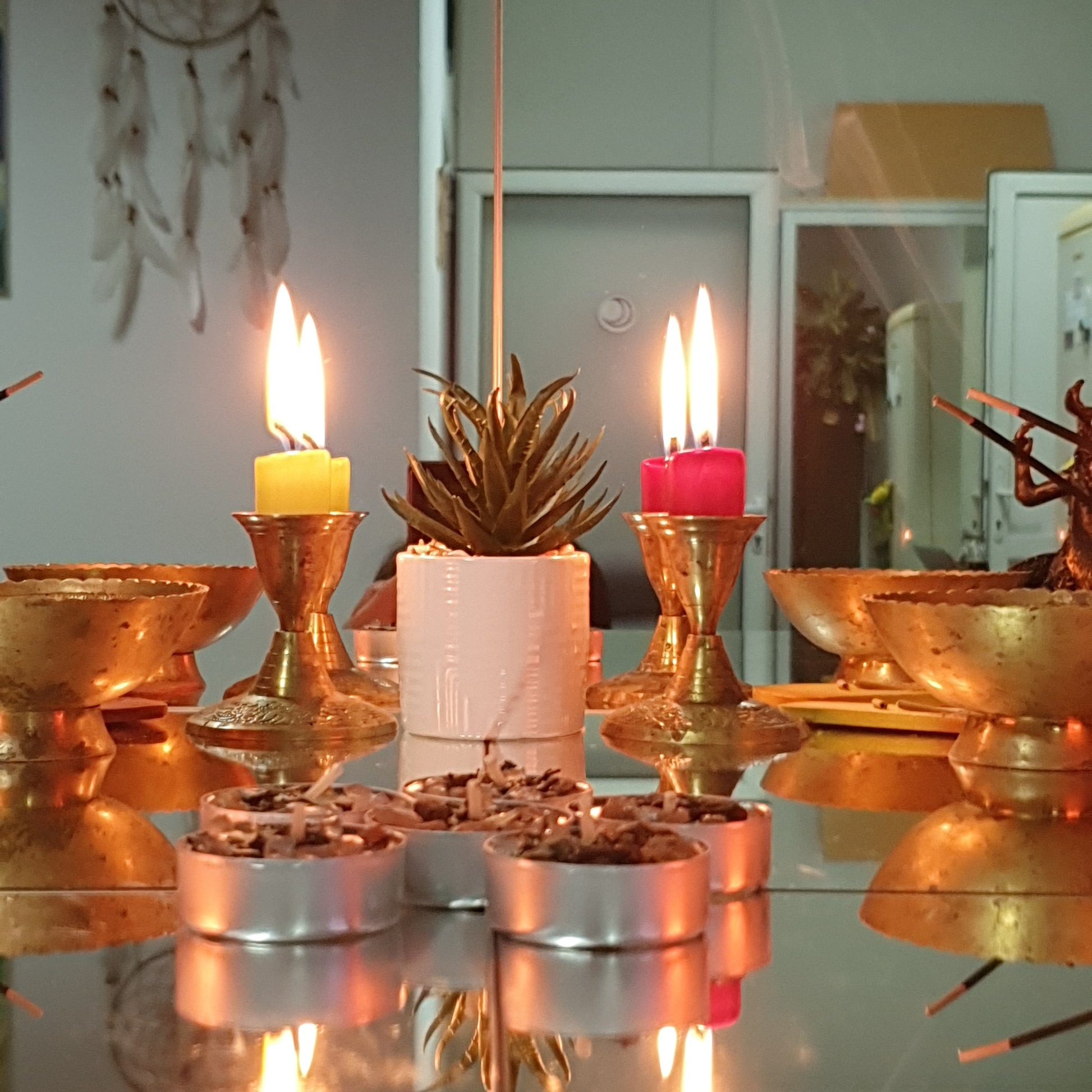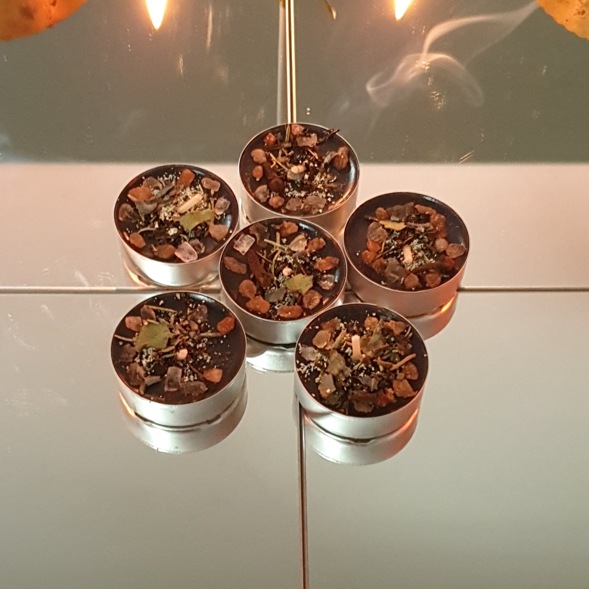Lumânare de protecție, de culoare neagră, pastilată cu diverse plante, uleiuri și săruri pentru materializarea rapidă, eficientă și de durată a protecției.