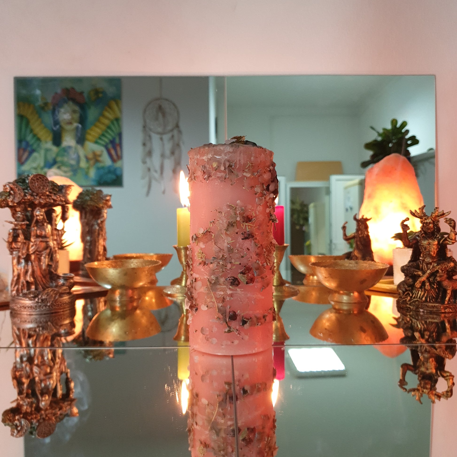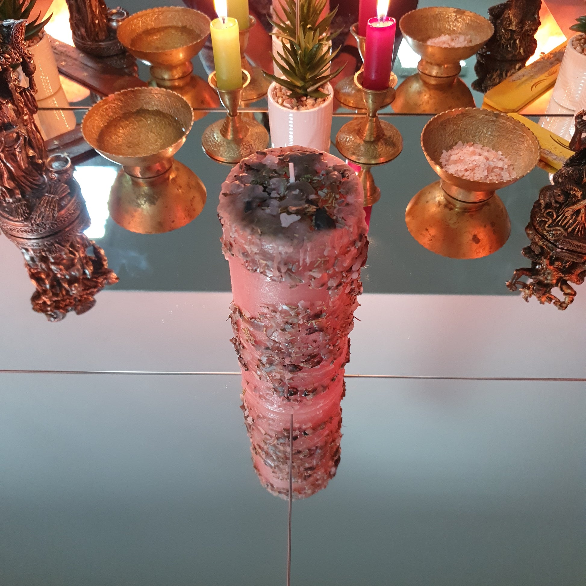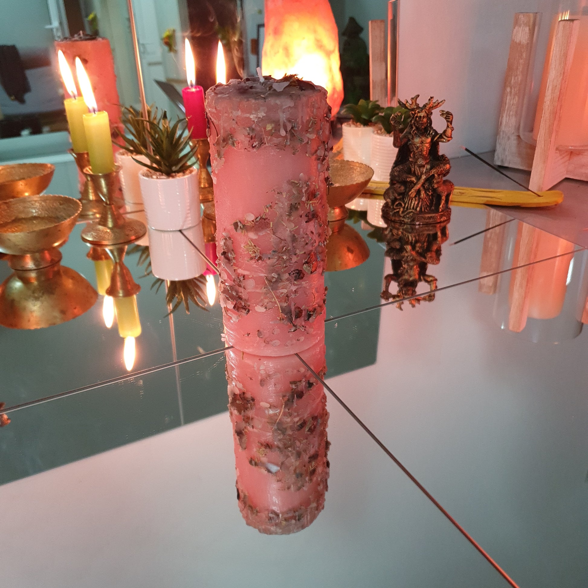 Lumânăre de culoare roz, ușor pastelată confecționată pentru materializarea iubirii de sine.