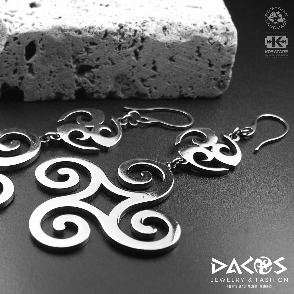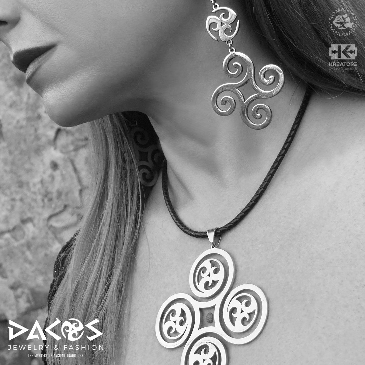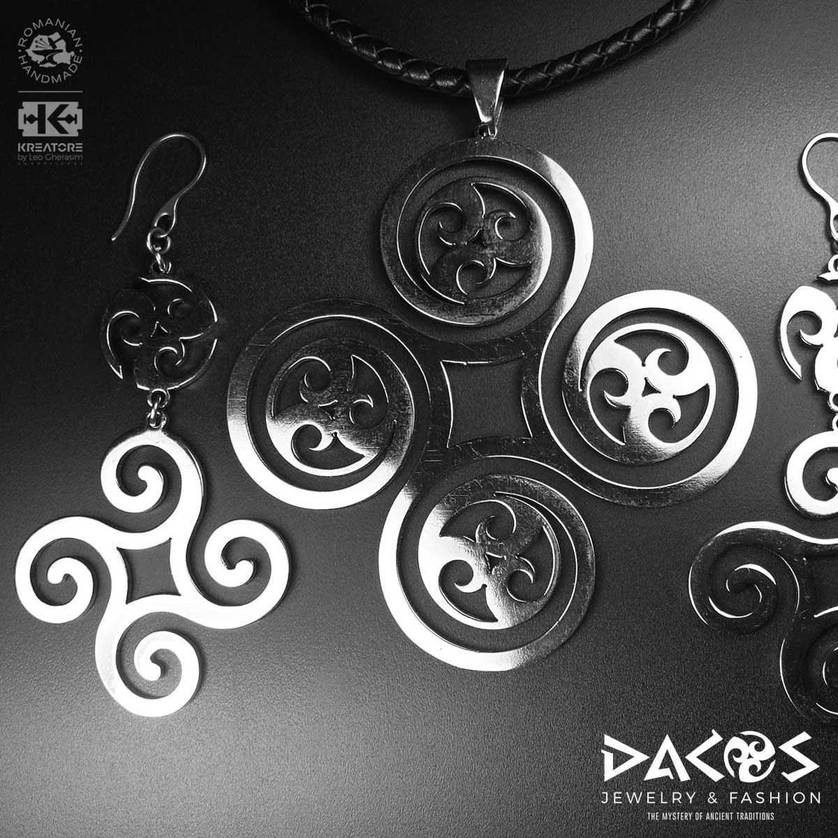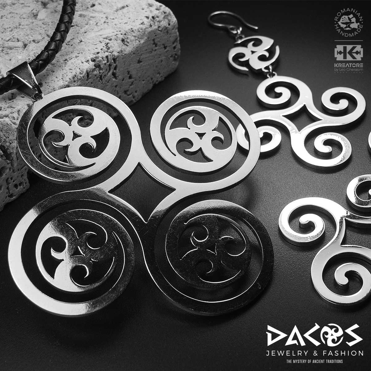 Setul de bijuterii dacice TETRASKEL SPIRALIS este un produs decupat/traforat în tablă de inox (oțel inoxidabil) cu o mașină laser CNC, ulterior prelucrat și finisat manual (handmade), cu un design contemporan unic, inspirat din culturile neolitice, celtice și geto-dacice, realizat numai pe comandă, în serie limitată și exclusivistă. Este o bijuterie „statement”, „care te îmbracă”, punându-te rapid în valoare, fiind remarcată. Pandantivul poate fi asortat oricărei ținute tradiționale sau teatrale, moderne sau clasice, casual sau glam. Dedicat persoanelor curajoase și extrovertite.