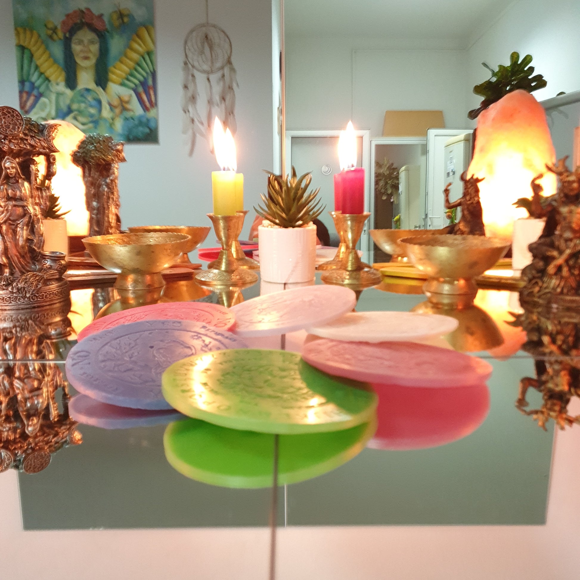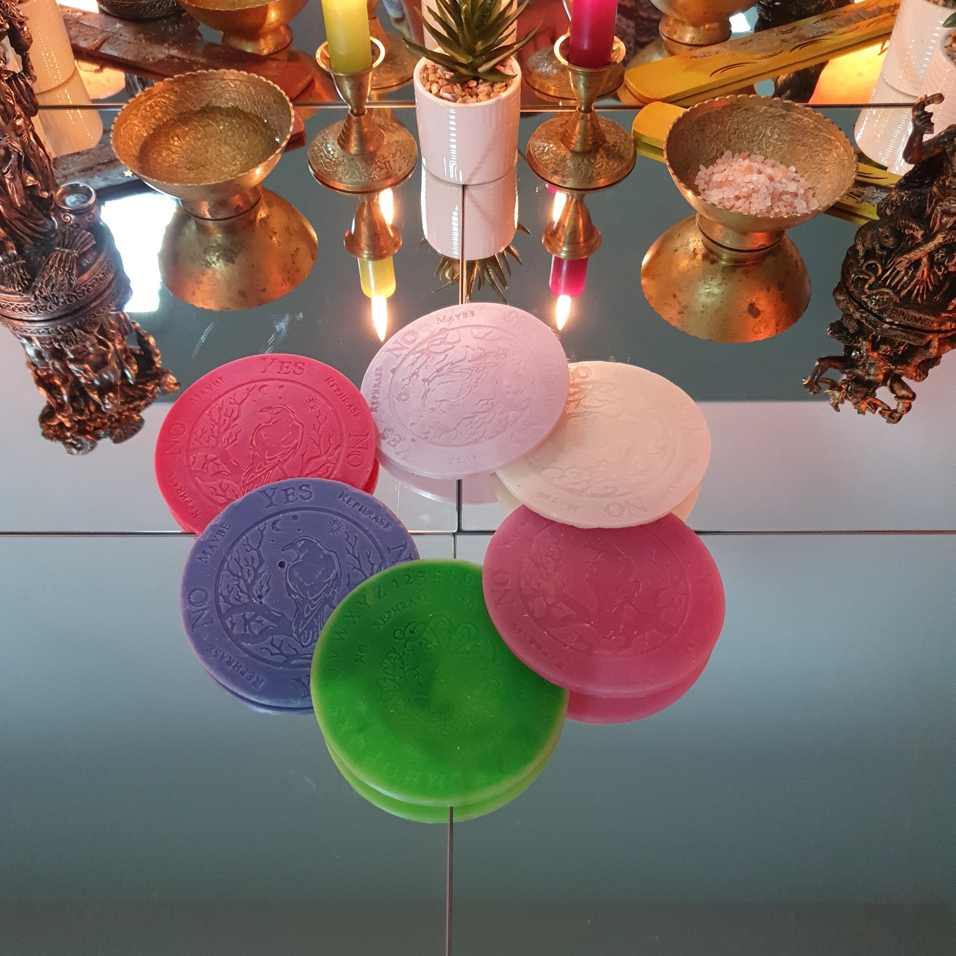 Planșă din ceară/ipsos cu formă pentru radiestezie, cu simbolurile răspunsurilor la intrebări de tipul DA, NU, POATE.